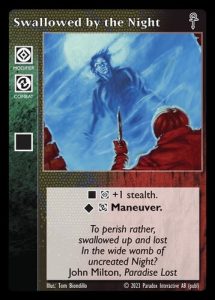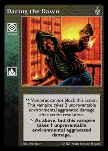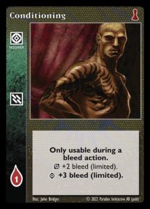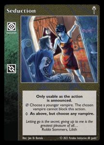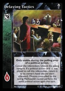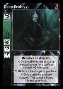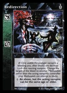 Ha habido una época en la que se jugaban entre 12 y 18 de esta carta porque es así de buena. Endereza, da intercept, se pueden jugar varias sobre el mismo vampiro teniendo varios barones y lo único “malo” es que obliga a bloquear.