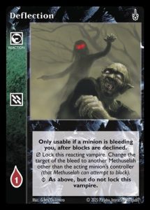 De todas estas la más peligrosa es el deflection porque, jugada a alta, no gira el minion que reacciona de forma que, un solo minion enderezado, puede seguir jugando deflections indefinidamente mientras siga teniendo sangre para pagarlos.