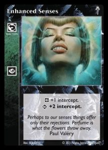 Hay multitud de cartas de intercept aunque principalmente las encontramos en auspex y animalismo aunque no exclusivamente. Algunas de las que hemos mostrado en los wakes también dan intercept. Si una carta hace más de una cosa bien es rarísimo que no se juegue mucho. Nos llevaría mucho tiempo listar las cartas de intercept, al final tendrás que ir viendo lo que se juega a base de partidas y de investigar barajas.